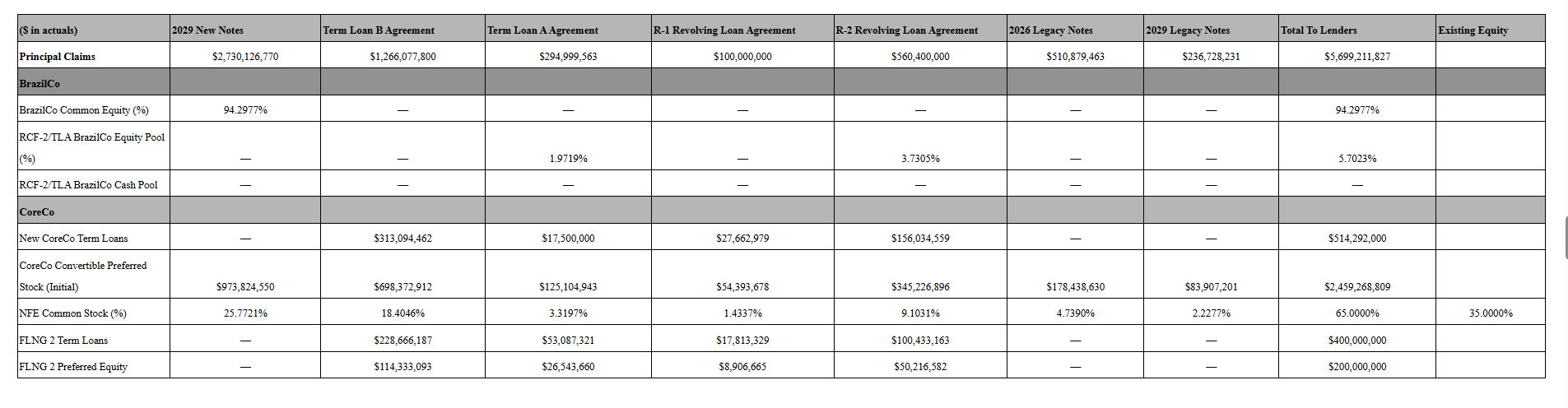 BrazilCo – a new, privately held entity owning the Brazilian terminals and power plants: Barcarena, CELBA, PortoCem, and the Santa Catarina/TGS terminal. Goes private. Owned by creditors. Managed by existing NFE management.
